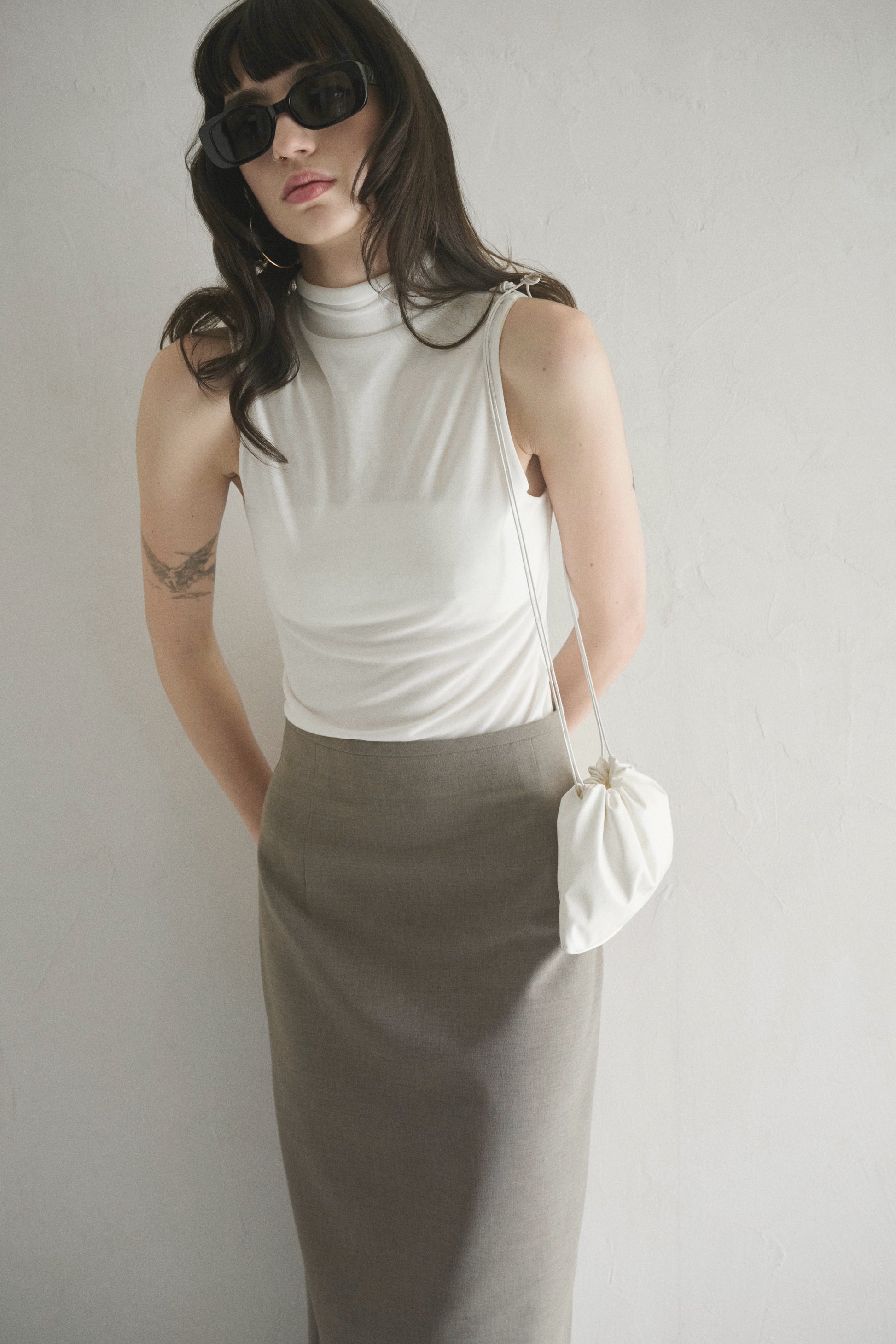 やわらかなフォルムが印象的な、ドローストリング仕様のミニバッグ。ミニマルなスタイリングに自然に溶け込みます。