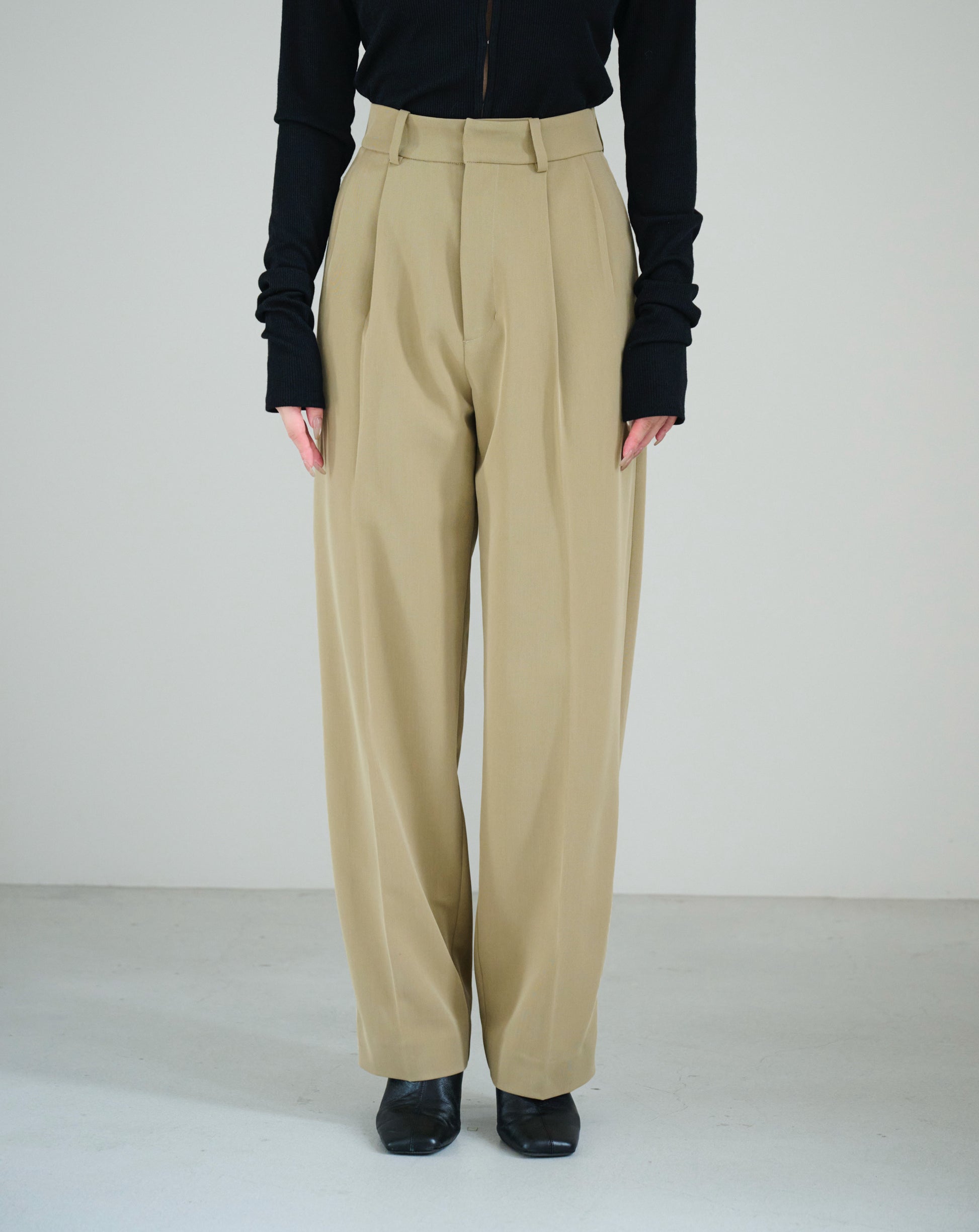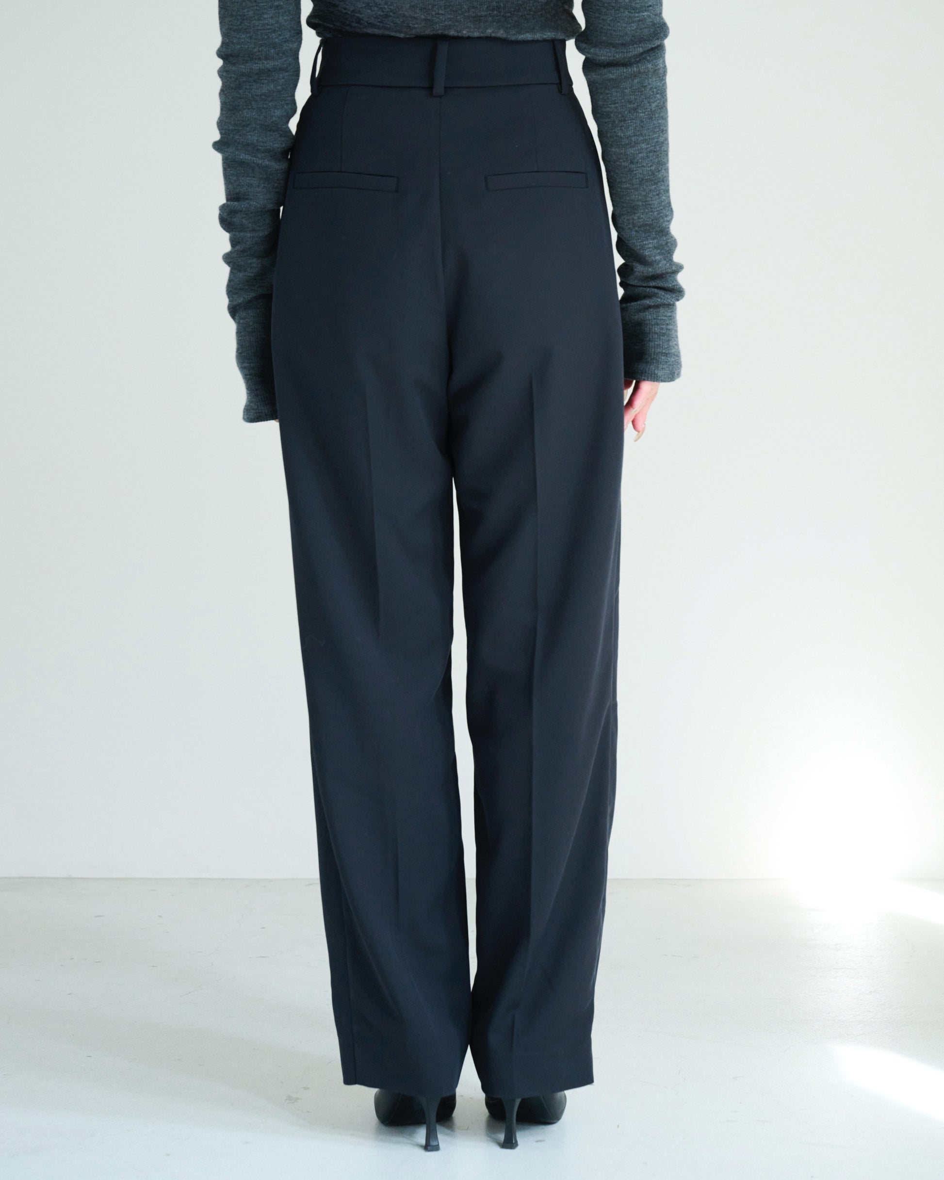 フロントに入ったツータックが腰まわりにほどよいゆとりを与え、すとんと落ちるシルエットを描くハイウエストパンツ。 腰位置を高く見せる設計で、脚のラインをすっきりと美しく引き立てます。 シンプルながらニュアンスがあり、合わせるトップス次第で表情を変える一本。 カットソーやニットと合わせれば抜け感のある着こなしに、シャツやジャケットと合わせればシャープで端正な印象に仕上がります。
