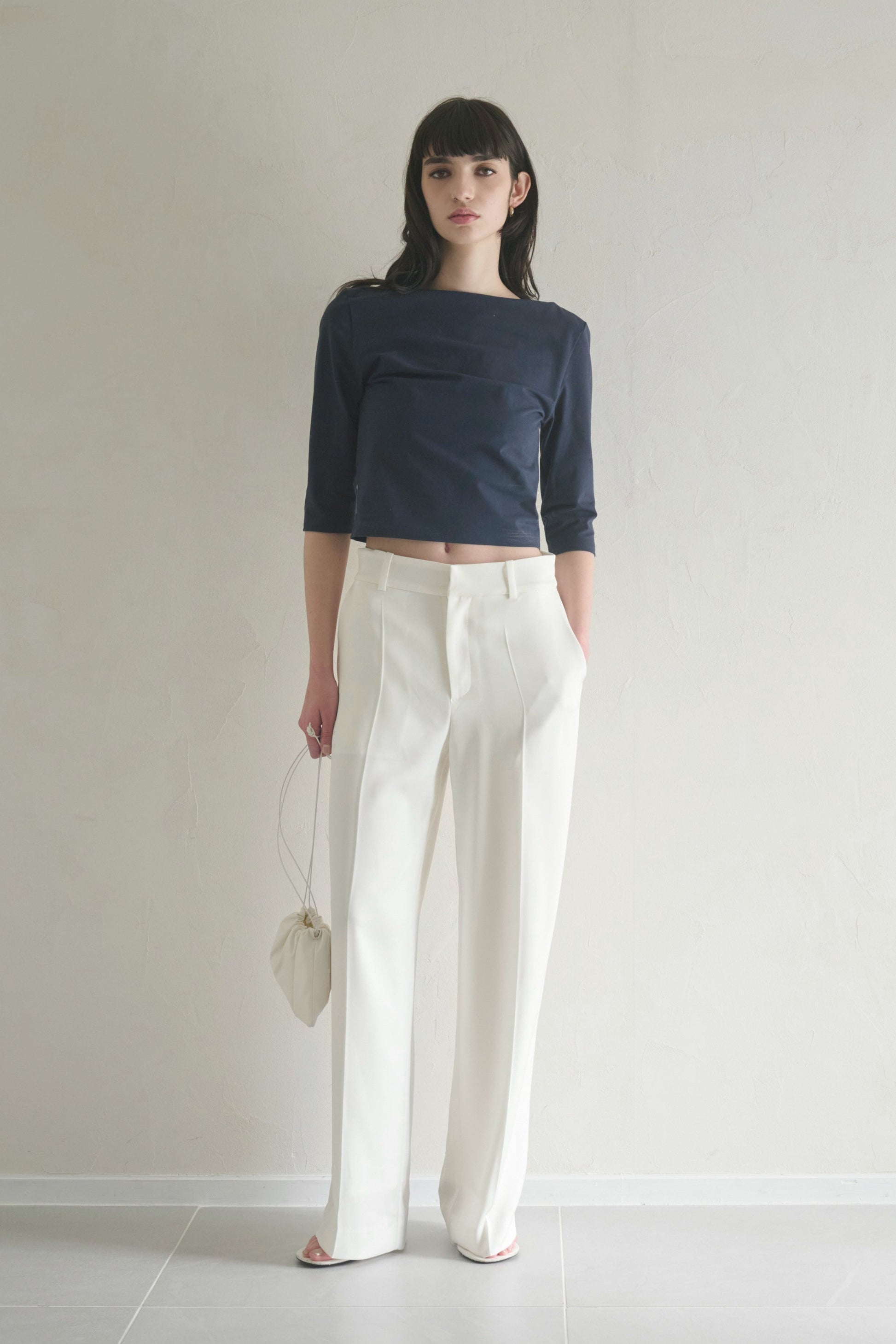 ボートネックのラインが、首元から肩にかけてのラインを美しく見せるトップス。装飾を削ぎ落としたミニマルなデザインで、女性らしい輪郭を静かに引き立てます。