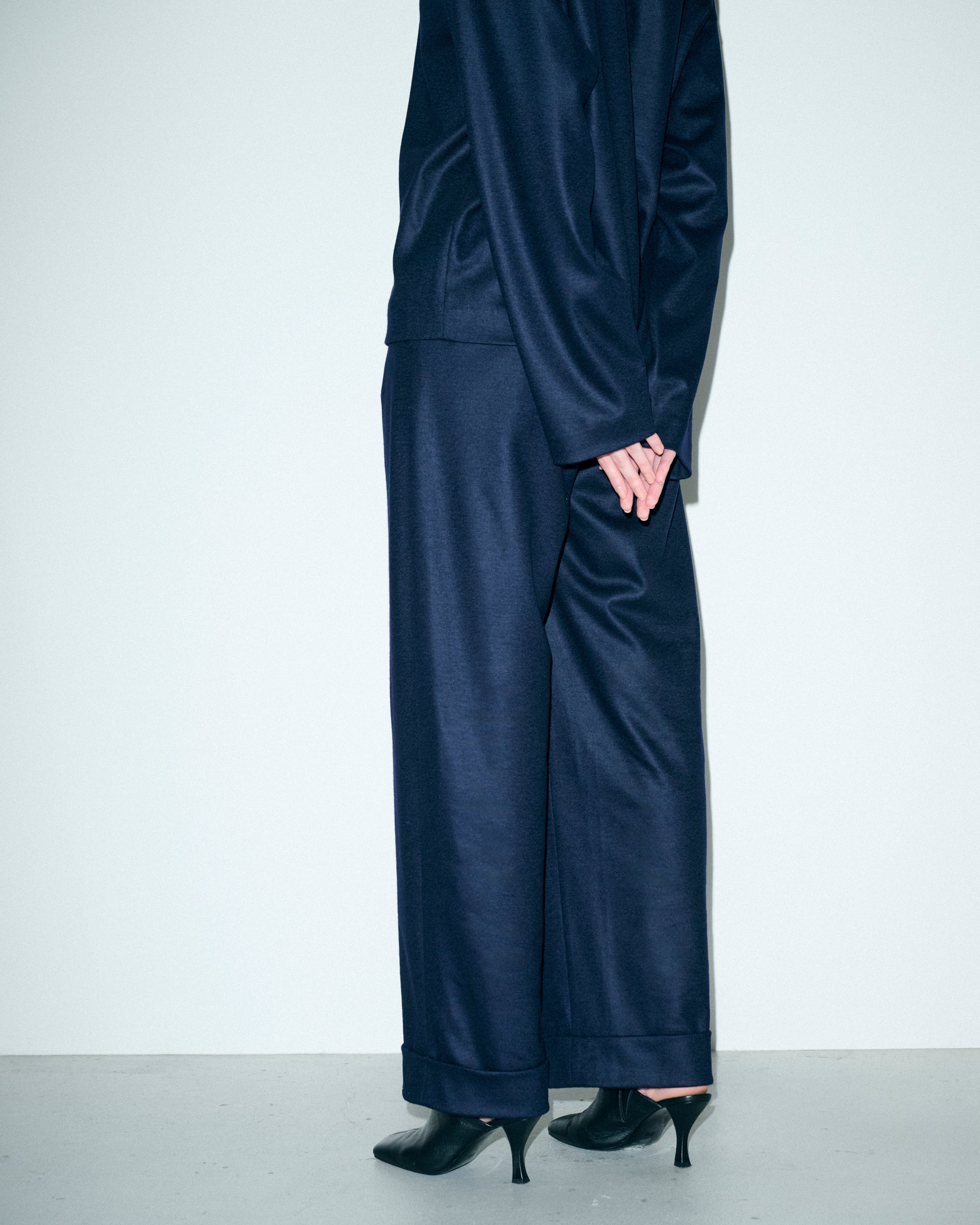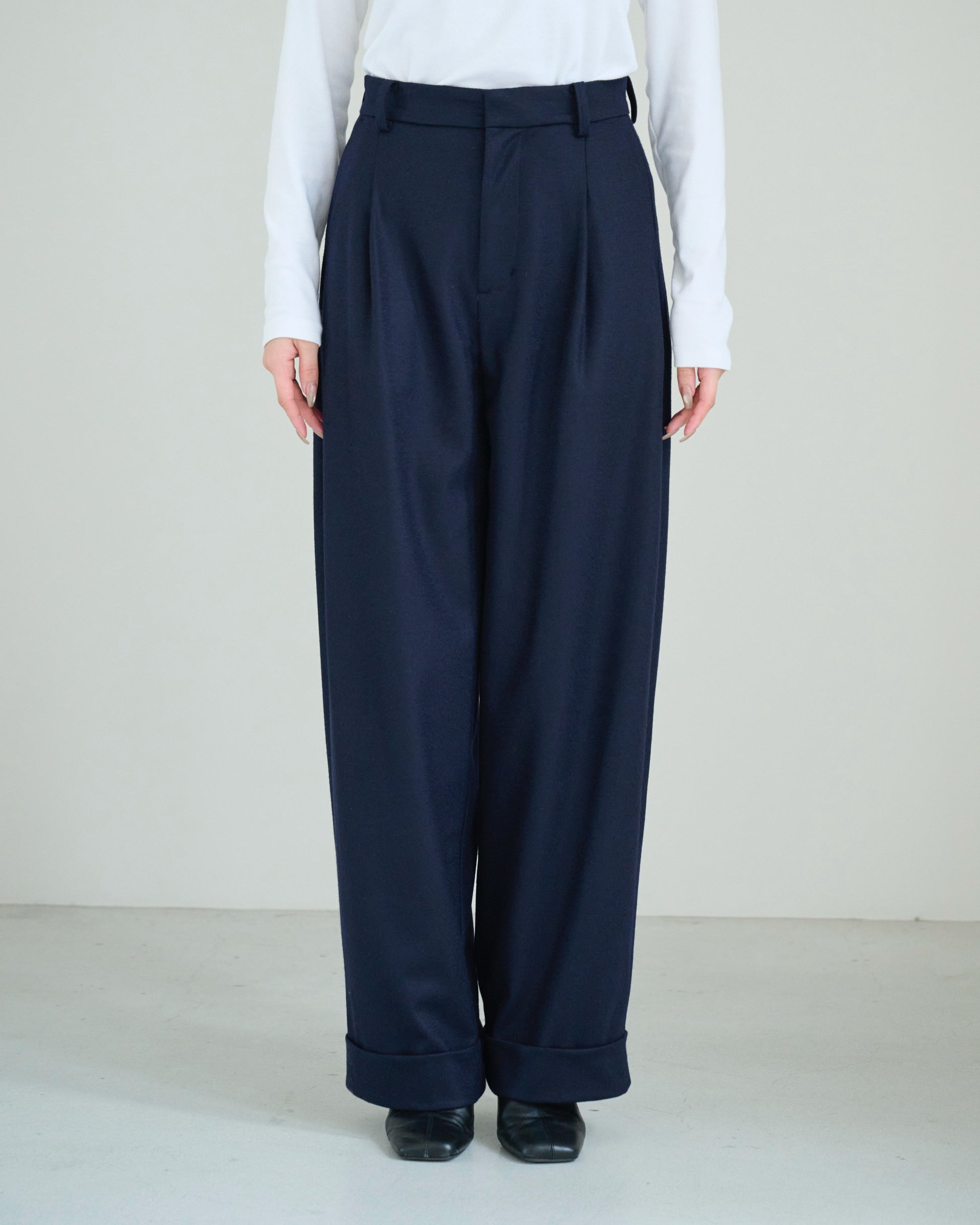 裾をダブル仕立てにすることで、全体のバランスに奥行きを与え、重たくならずに立体感のあるフォルムを演出します。ヒップや太ももを包み込むような柔らかな履き心地と、構築的なラインの両立が叶う一本。 ヒールにもフラットにも合わせやすく、フォーマルにもデイリーにも対応します。