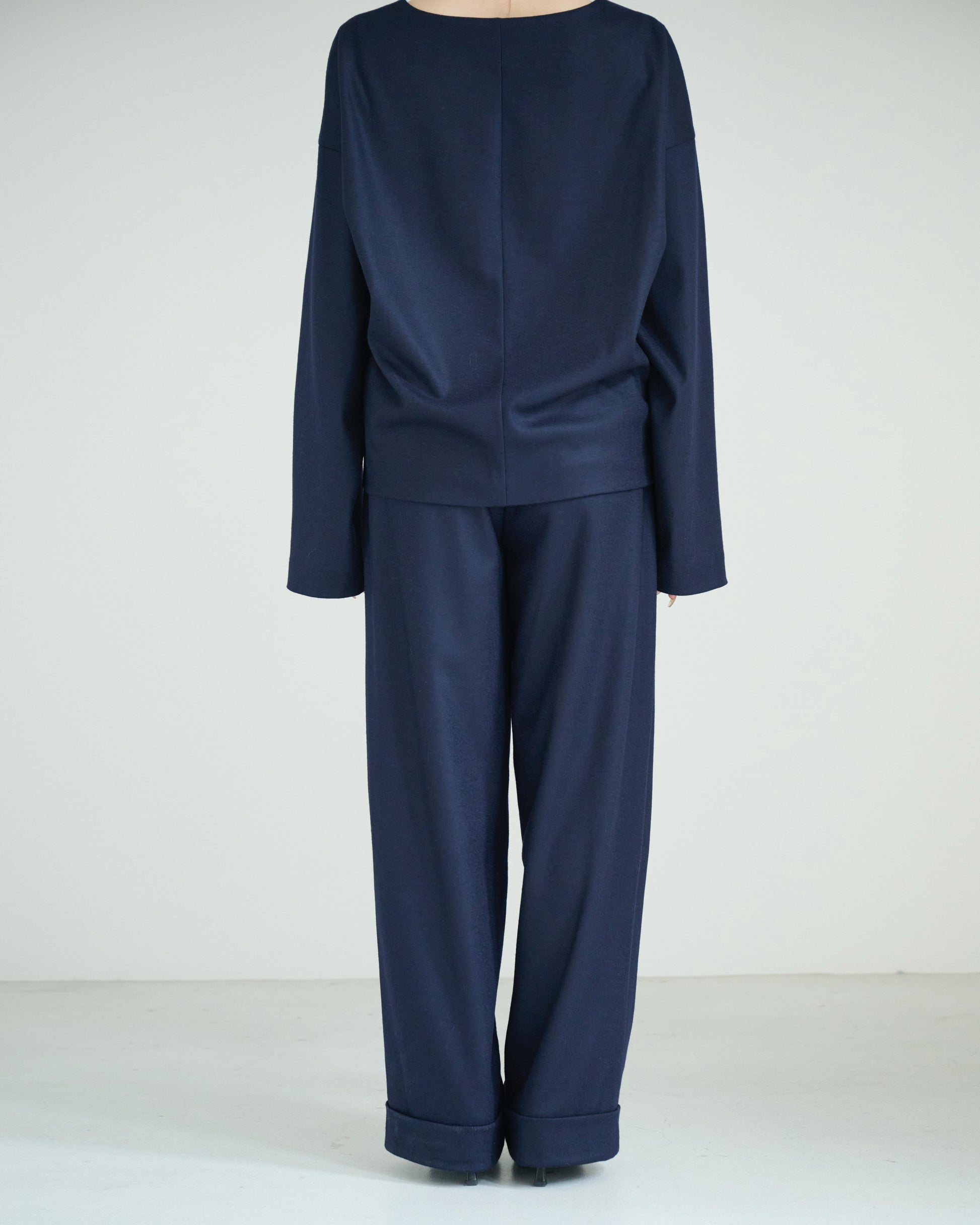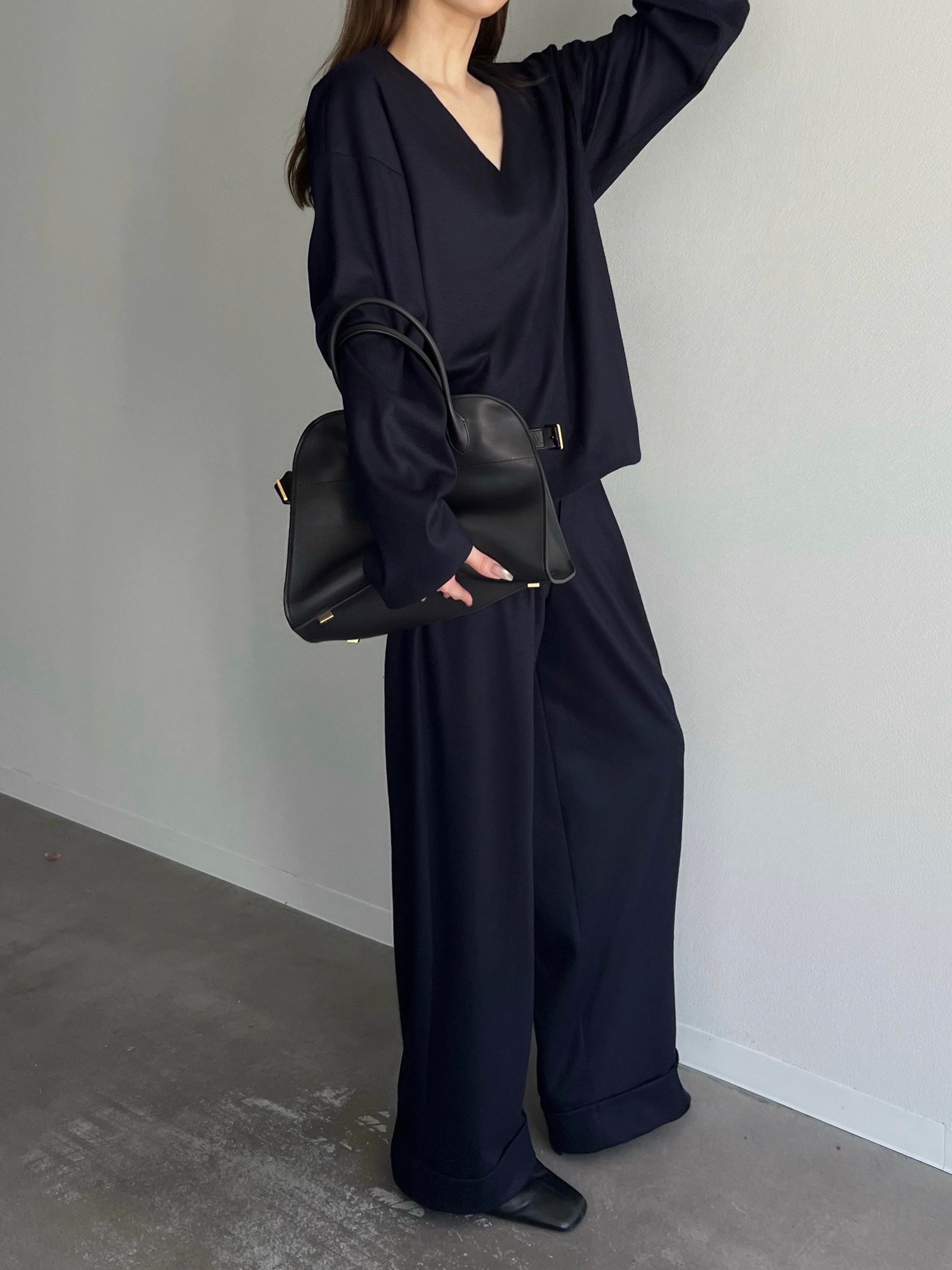 動くたびに美しいドレープを描きます。ウエスト位置をやや高めに設定し、脚のラインをまっすぐに見せるワイドストレートシルエット。