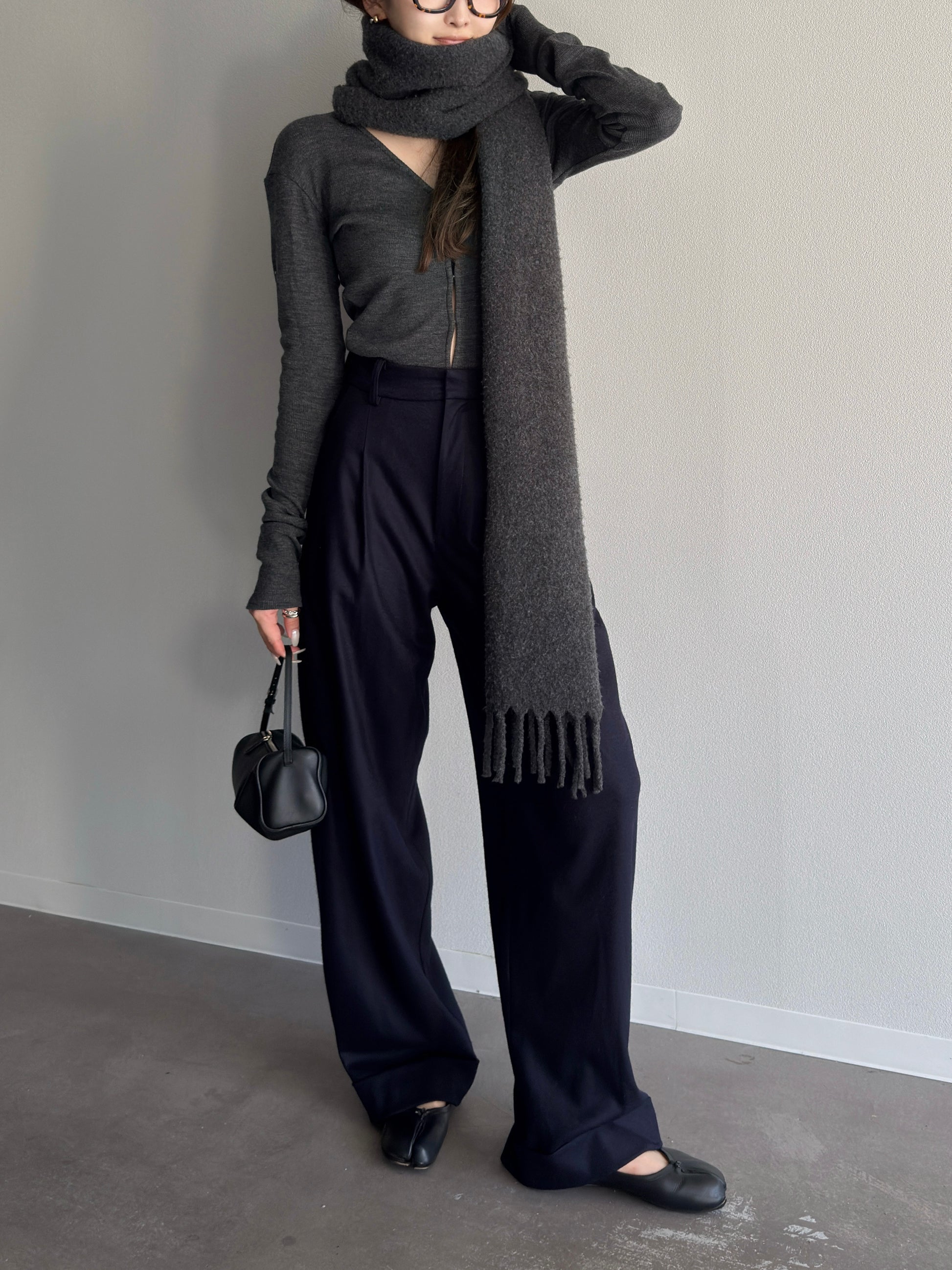 同素材のトップスとセットアップで合わせると、静かに強さを感じるクリーンな印象に。ブラウスやニットと組み合わせてもシルエットの美しさが際立つ汎用性の高い一本です。